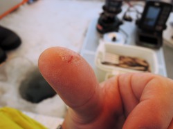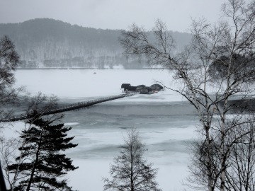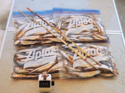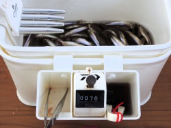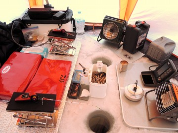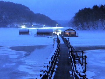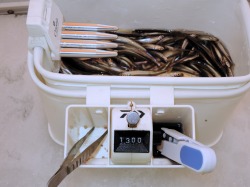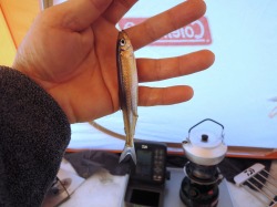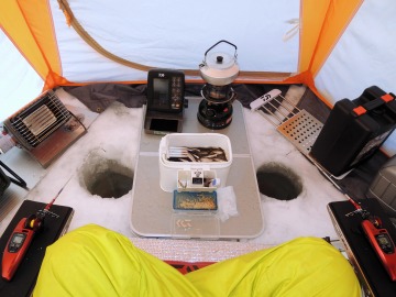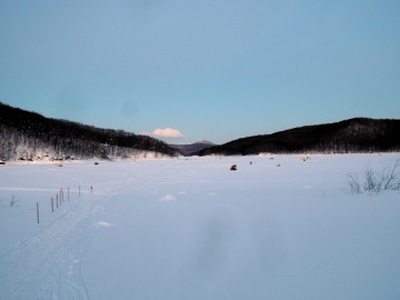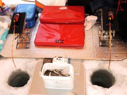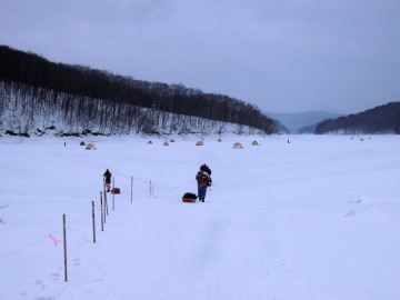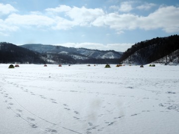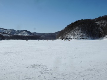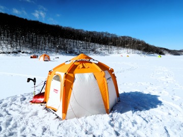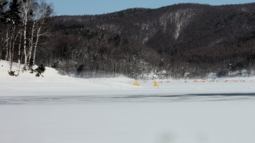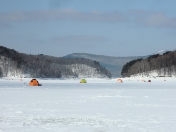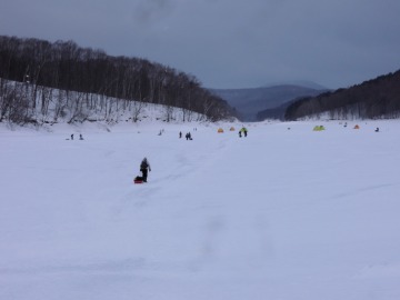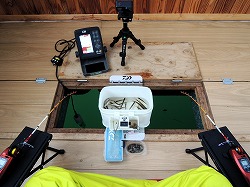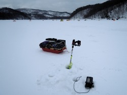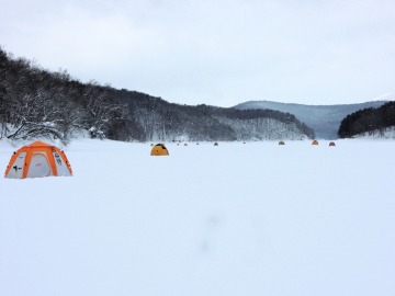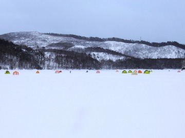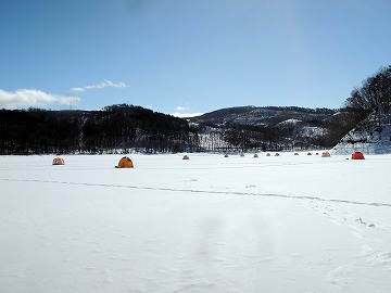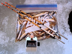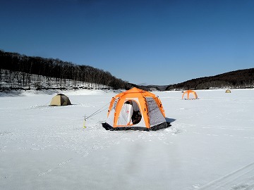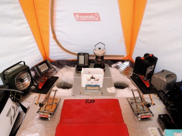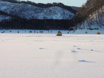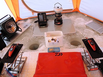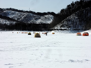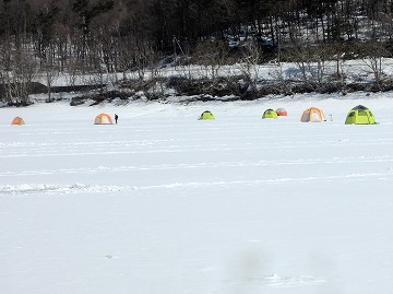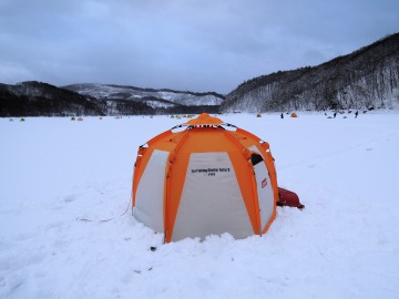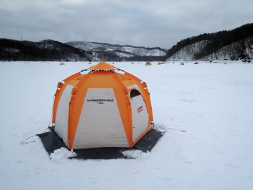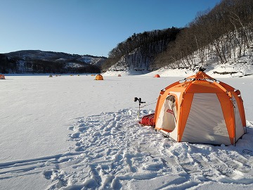 26'ワカ様 釣行記 2026年03月06日(金) ・・・岩洞湖氷上(第6戦)超食い渋りの来客テントで二人仲良く撃沈!・・・ I藤氏のお誘いで、6時に小石川で待ち合わせ。 年に1〜2回しか使わない来客用テントを積み込み、乾燥路面の455号を軽快に飛ばして岩洞湖へ……。 ![]() I藤氏のGPS搭載の高級魚探でポイント探索 ここぞというピンポイントにテントを設営 現着すると、速攻で氷上へ下り立ち、8mラインをI藤氏の切れ味鋭いドリルでサクッと数発穿孔。 さらに、I藤氏のGPS搭載の高級魚探でピンポイントを絞り込み、テントを設営。 ![]() I藤氏が王様で、オラは平伏す家来みたいな構図 釣り座の配置はいつもと変わらず 流石に来客用テントは広い。 ……はずなのだが、二人で入ると何故か狭苦しく感じるんですけど。 ![]() お気に入りの「二組」に託します 魚影は途切れることなくモリモリ入って来る 分厚い魚影が途切れることなく入って来るのだが…… 頑として口を使ってくれないし、忘れた頃に穂先を揺らすのは、ほとんど当歳魚。 そんな超気難しい群れにおちょくられて、I藤氏と二人で悶絶! 自信を喪失しそうなくらい釣れないけど、一人じゃないので、めげることはない。 試しに、I藤氏のクリーク(ERUZA 8)を借りて使ってみたけど……。 あまりにも繊細すぎて、ガサツなオラにはとても使いこなせる穂先ではなかったす。 ![]() ダメだそろそろ止めるべ・・・ 二人仲良く撃沈しました そんなこんなで、14時まで「お話友の会」を楽しんで、釣果は115匹!(当歳魚が9割) 【リール】左右:レイクマスター CT-T 【穂 先】左右:GANDOU STICK 30 【仕掛け】左右:「二組」5本1.0号 【オモリ】左右:3.0g 【エ サ】「白サシ」と「紅サシ」をランダムに使用 そして、I藤氏の教育的指導を受けながらテントを撤収。 テントの持ち主のオラより、断然手際がいいのだ。 ドリルでの穿孔もI藤氏、魚探での探索もI藤氏、テント設営も撤収もI藤氏頼み……。 釣果はさておき、オラはとっても楽をさせてもらいました。 YouTube「岩洞湖氷上(第6戦)超食い渋りで二人仲良く撃沈!」 2026年03月02日(月) ・・・岩洞湖ドーム船(第4戦)幼児虐待でワカサギ釣りが嫌いになる前に早上がり・・・ 朝方の薮川(岩洞湖)は氷点下二桁まで冷え込み、氷上はベストコンディションだすども……。 如何せん、駐車場に積雪がなく泥土が露出している。 ひとりでは泥の上をソリは曳けないので、ここはひとつ、ドーム船へ直行だす。 ![]() かなり水位が下がっている 2・4・5番船が空いている 6時過ぎに受付を済ませたが、船内はガラガラで、オラが4番目のお客さん。 4番船の右奥に釣り座を構える。 ![]() 桝蓋を開けると冷気で寒い 最近お気に入りの仕掛けだす 仕掛けを下すと群れがモリモリ 寒さで手が悴み、仕掛けのセッティングに手間取ったものの、6時半には何とか仕掛けを投入。 スタート直後は、仕掛けを下せば群れが途切れることなくモリモリ入って来る。 ……ただし、群れは全て当歳魚だす。 8時半頃までは、そのマイクロ魚たちが健気に竿先を震わせてくれたものの……。 次第に群れの間隔が遠のき、10時半以降はピタリと止まってしまった。 群れさえ入ってくれれば何とか拾えるんだすども……。 そんな状況でも、穂先を軟調胴調子に替え、オモリも3.0gから2.0gへ軽くして、とにかくソフトな誘いを心掛ける。 ![]() 群れが入って来ない 自分の仕掛けだけが映っている しかし、肝心の群れが入らない。 魚探に映るのは、自分の仕掛けの上下運動だけという虚しい映像……。 ![]() 幼児(当歳魚)虐待だす その後、正午までの1時間半、一度もアタリをもらえず……ついにギブアップ! 本日の釣果は76匹!(100%当歳魚)……まるで幼児虐待だすべだ。 てな訳で、昼食をかき込み、黙々と後片付け。 ワカサギ釣りが嫌いになる前に、静かに退散させていただきました。 【リール】左右:レイクマスター CT-T 【穂 先】左右:GANDOU STICK 30 ⇒ GANDOU STICK 軟調胴調子 【仕掛け】左右:「定番ナイロン」5本 0.5号 【オモリ】左右:3.0g ⇒ 2.0g 【エ サ】左右:「白サシ」&「紅サシ」ランダム付け ![]() ドーム船周りの氷はまだ大丈夫だす 今シーズン、もう少しお世話になります ドーム船は、相変わらず群れが入って来るのは朝方だけ、陽が高くなると群れが途切れてしまって手も足も出なくなるという状況が続いているのだ。 YouTube「岩洞湖ドーム船(第4戦)幼児虐待で早上がり」 2026年02月26日(木) ・・・岩洞湖氷上(第5戦)2月の最後は十数年ぶりに小石川対岸の山際へ・・・ 昨日は、岩洞湖に恵みの雪が降り、今朝はガリッと冷え込み、夜明けとともに青空の絶好の釣り日和! ……今日釣りに行かねば、非国民になるべさ。 ![]() 対岸の山際にテントが集中している 右岸の道路側にもテント村 浅場の当歳魚の数釣りよりも、数は望めなくとも良型狙いで、十数年ぶりに小石川対岸の山際を探索……! ![]() 山際にテントを設営したのは十数年ぶり ポイントを絞るのに、電ドリのバッテリーが虫の息になるまで吟味。 よ
